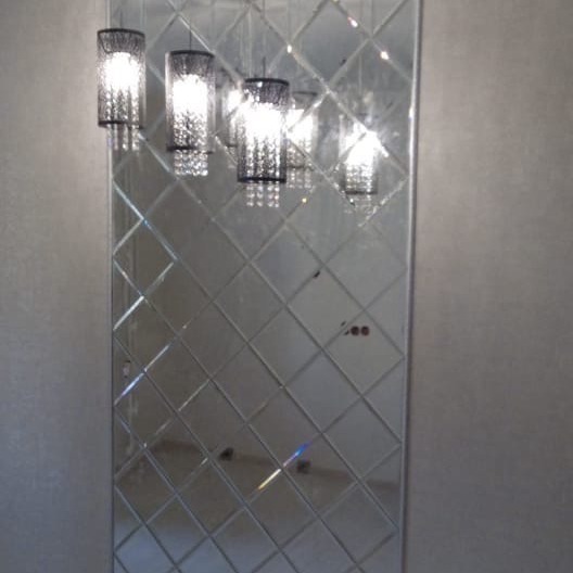 Зеркально панно было сделано из зеркальной плитки 30х30 см, размер панно 255х255 см