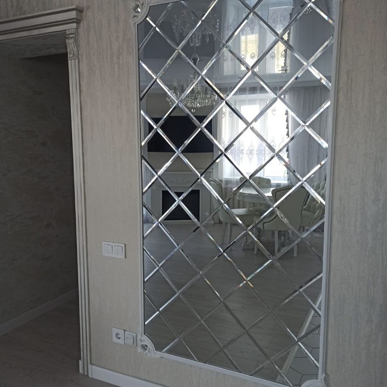 Зеркально панно было сделано из зеркальной плитки 30х30 см, размер панно 255х255 см